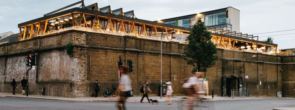 The design draws on the heritage of its location, with an undulating steel pattern, and acts as crown, signaling North London’s newest hotspot. Bespoke V-shaped columns reference horse stable design, alluding to the history of the site and highlighting the north corner of Camden Market.
