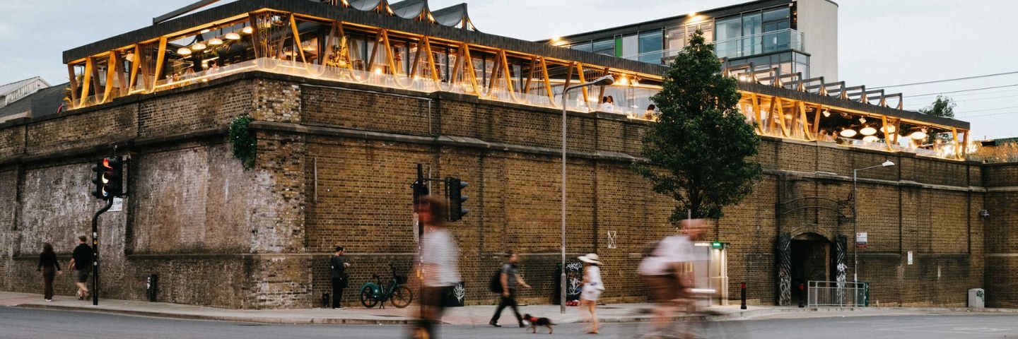 The venue reuses an historic site, originally a transitory site for working horses, to transport goods between the railway and the canal. The new canopy is offset from the historic walls, and is designed as an independent structure, which minimises any impact on the existing site. The blackened steel patina finish references the steel and or wrought iron historical features that exist throughout the market, tying into the industrial heritage of the site. This is in contrast to the multi-coloured stock brick in the listed wall, but also connects to the dark tones in the pier stone copings