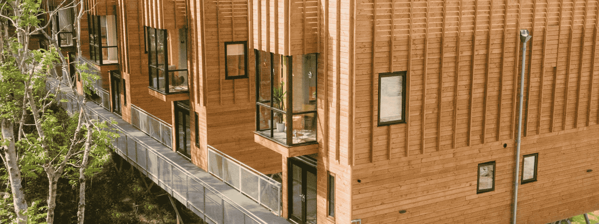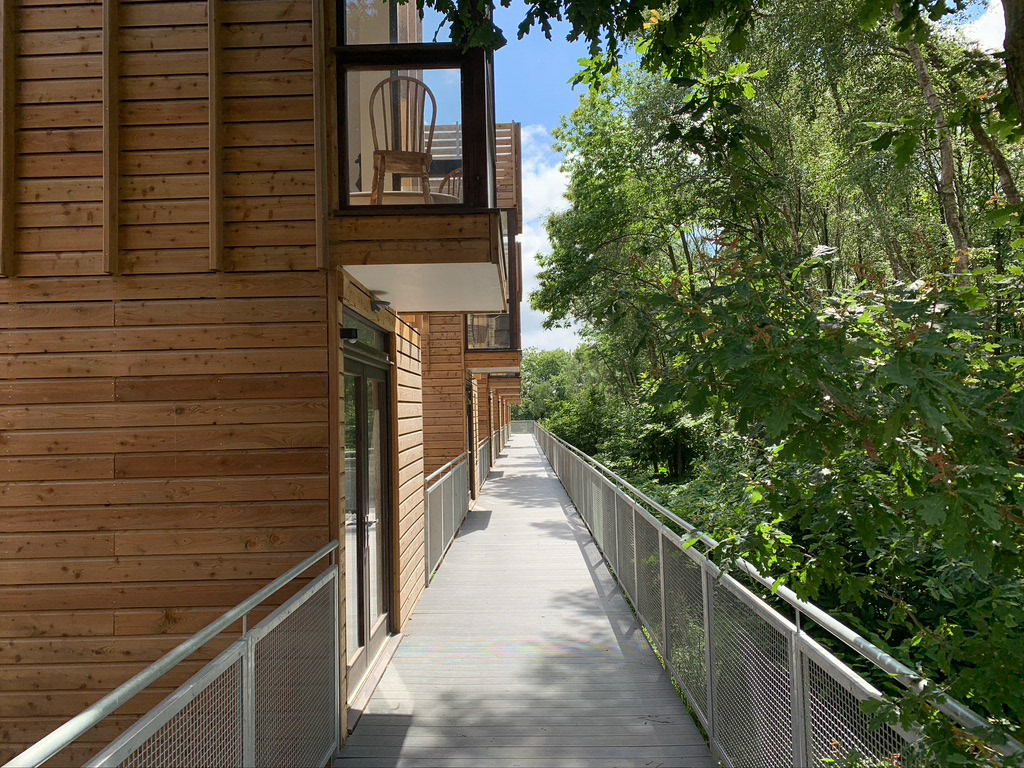 From the outset it was agreed that timber would be used for the buildings’ superstructures, cladding, and external access decks and stairs. But circumstances changed.