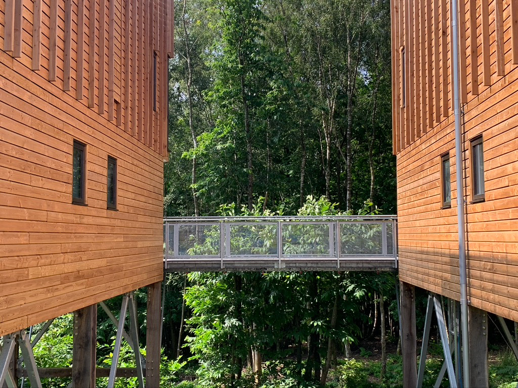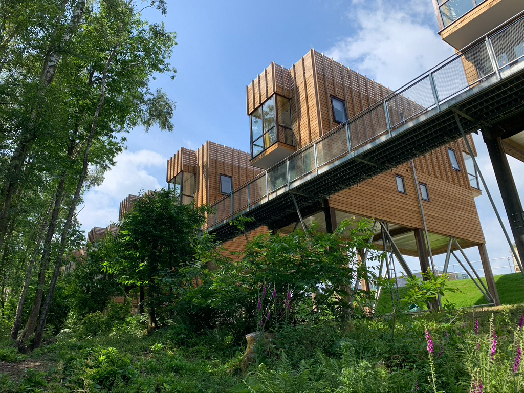 The site includes a series of eight timber two-storey work spaces built on stilts, a 900 m2 focal building and rooftop greenhouse and adjacent restaurant space all constructed to allow ample natural light as well as excellent viewing of the surrounding woodland. Ten earth-embanked lodges, five houses (two being project-linked) as well as further single-storey workspace are also part of the site. Environmental, social and economic sustainability has been at the heart of the construction, with all timber sustainably sourced. Onsite solar power is generated from 300 photovoltaic cells located on building roofs, cladding, and canopies, with a grid of solar thermal units heating water directly from the sun. From the outset of the Flimwell Park project, the main aim was to build as much of the project as possible from timber and using locally-sourced timber where appropriate. Ideally, timber would be used for the buildings’ superstructures, cladding, and external access decks and stairs.