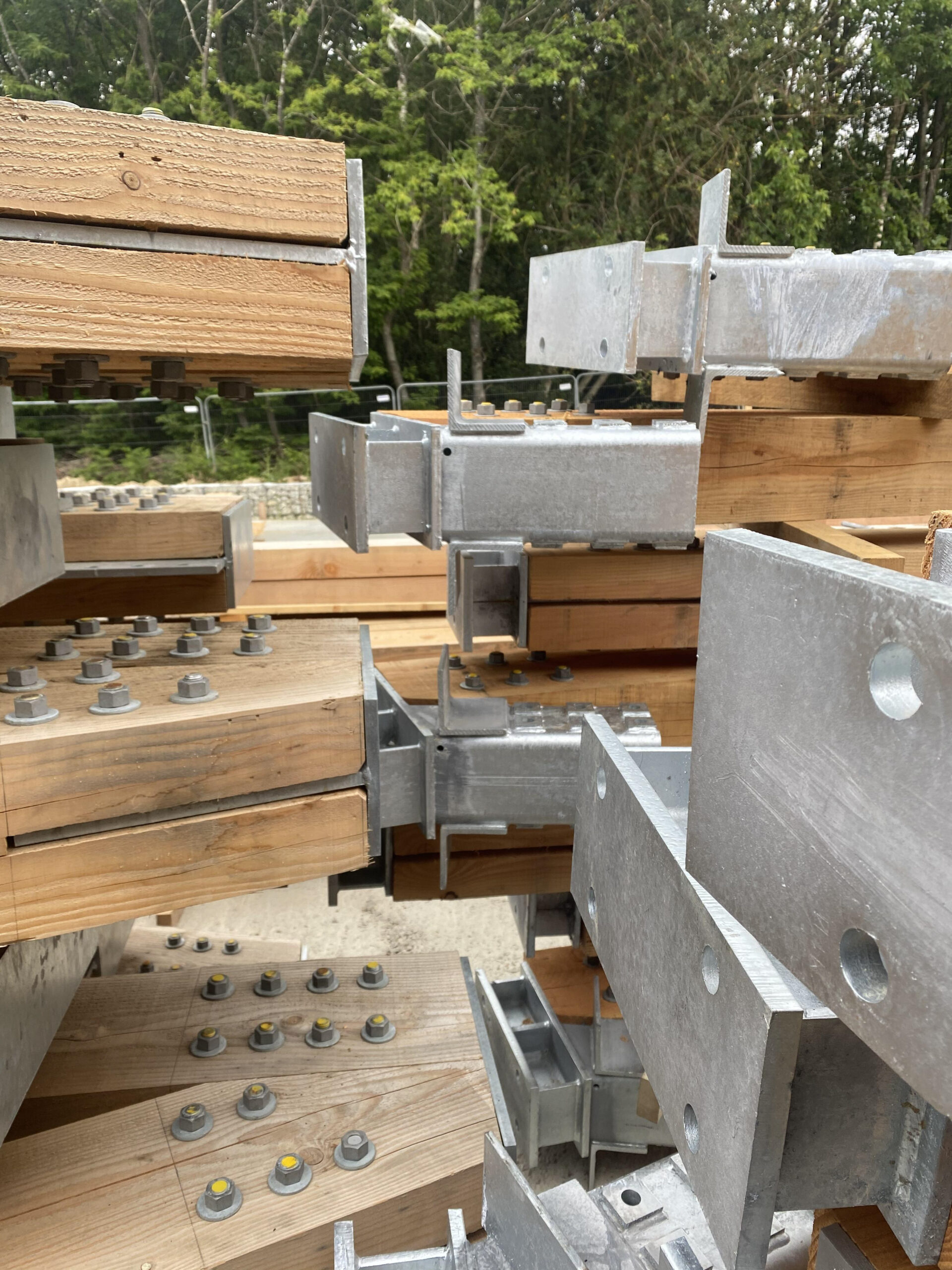 For Flimwell Park, this resulted in all domestic external balconies and surrounding facades to be made of non-combustible materials. Almost overnight, our designs for timber structures, stairs, decks, and balustrades were replaced with galvanised steel. On non-domestic stairs, balconies, and guardrails the decision was made to substitute timber structures and components with galvanised steel to create a visual cohesion across the site. This included, in some cases, external diagonal bracing working with timber posts and beams forming hybrid material structures. At times, when timber orders hadn’t been placed prior to the Lockdown, it was quicker to have galvanised steel components made rather than waiting for timber to arrive for time-critical elements.