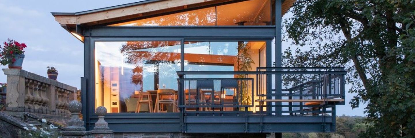 Rescobie Pavilion is a steel framed garden building, perched above a stone base, in the grounds of a nineteenth century schoolhouse in rural Angus, Scotland.
