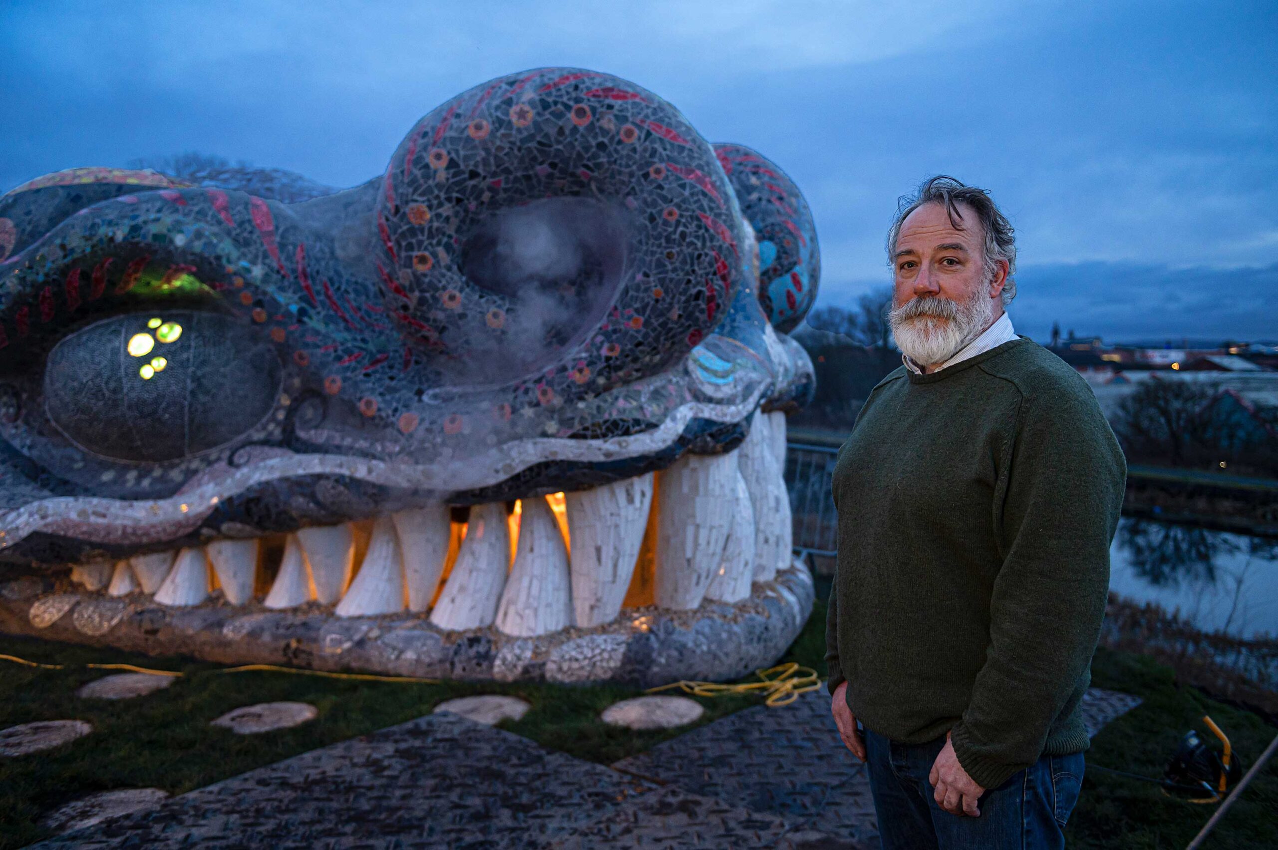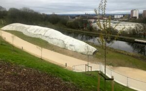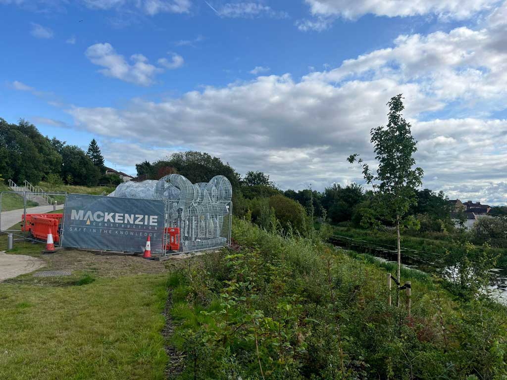The Beithir is a 120-metre-long artwork with an amazing, sculpted head. It has been formed from the spare earth from the landscaping of the site. This formed earth has been covered with ferrocrete and will be mosaiced over the next five years. It is the creation of Nichol Wheatley, a renowned Scottish artist who is known for his paintings and mosaic work. Nichol has served as the artist curator for the Stockingfield art project since 2021. Together with Alasdair Hamilton, the senior project manager for Scottish Canals they were keen to investigate the idea that a large iconic artwork might contribute to both the civic identity and the perception of a local district