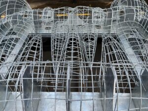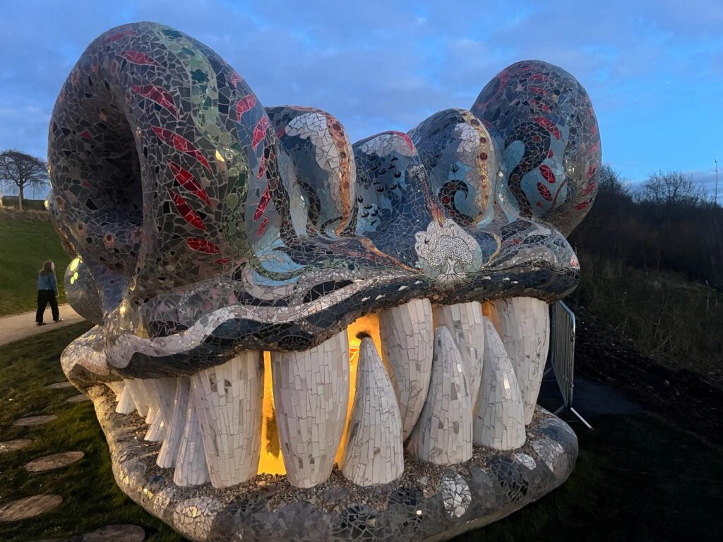 Where the body has been formed from reclaimed earth from the project the head was a large, complicated sculpture. The sculpture was designed to show a Beithir head with the mouth open. Within the mouth there is a World Egg – a symbol of renewal and hope. This was a very complicated structural construction. Not only did it have to function structurally, but the support structure had to be hidden by the creature’s massive teeth. The entire structure is made to the highest standards. Consequently, all of the steel sculpture was hot dip galvanized.